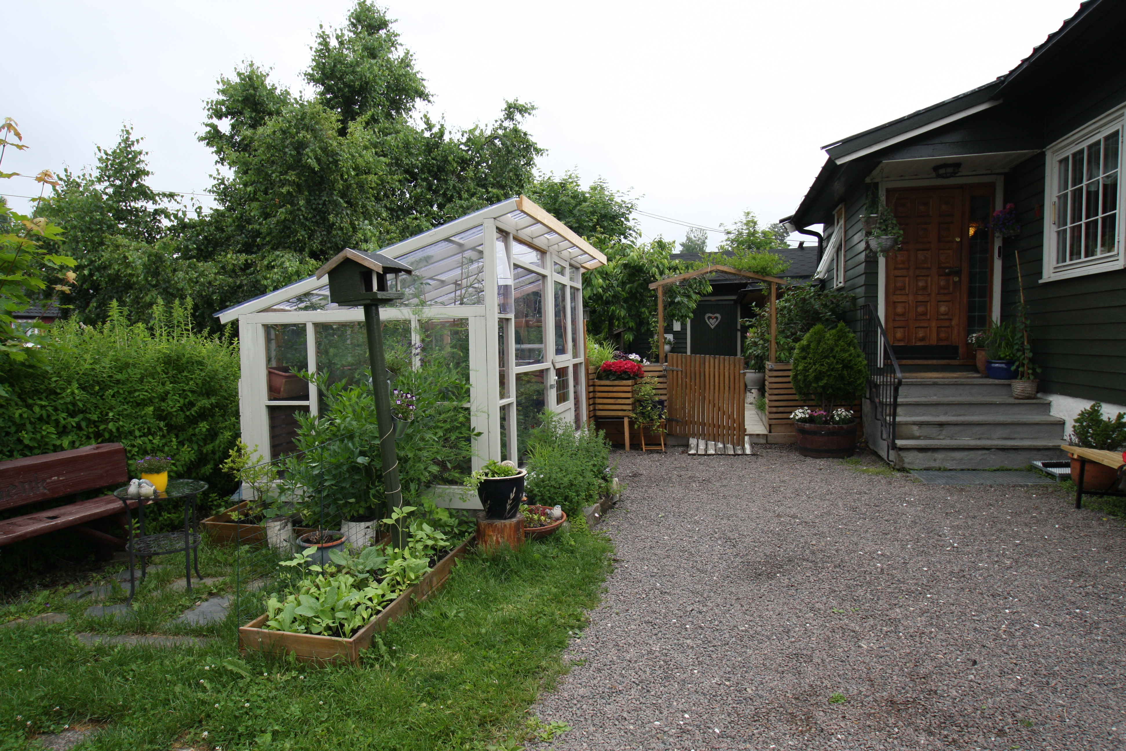 Drivhuset og oasen med en drøss med smarte løsninger er bygget opp av Arne Rist ved siden av husets inngangsparti. Den gamle garasjen som delvis er hønsehus har et hjerte på døren.