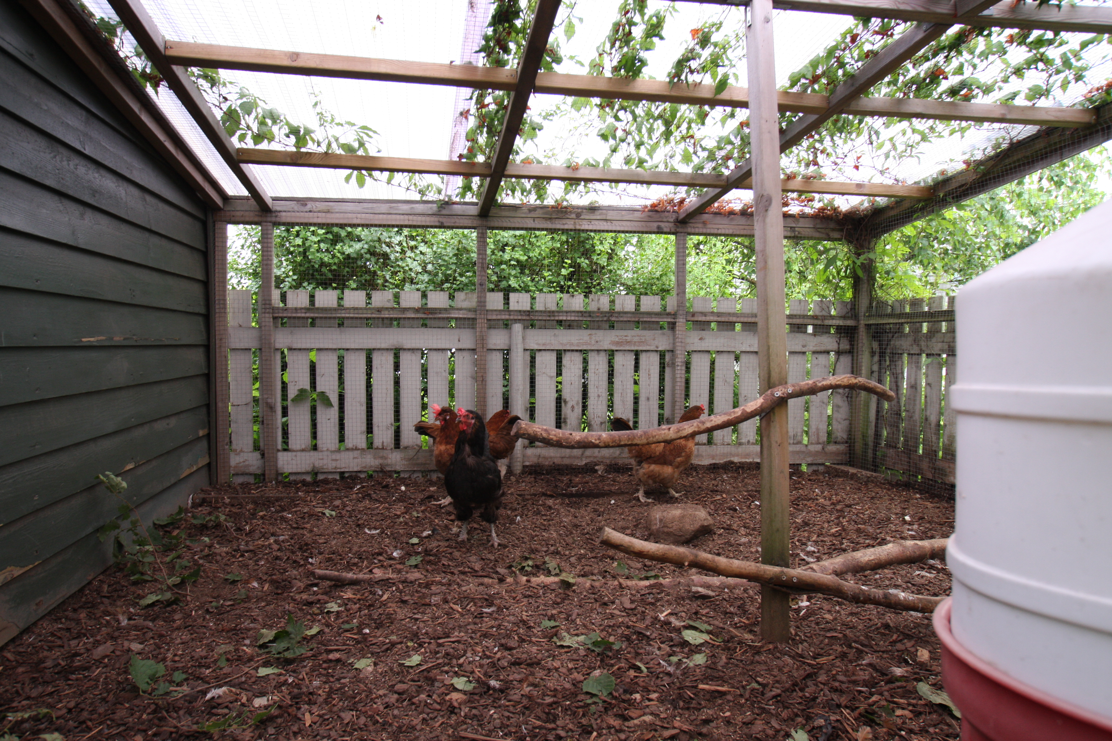 I hagen er det av og til både rev og grevling, så hønsegården er sikret med tildekket netting på bakken, et stakittgjerde rundt og koblet netting fra bakken og til taket som er dekket av klar bølgeplast.