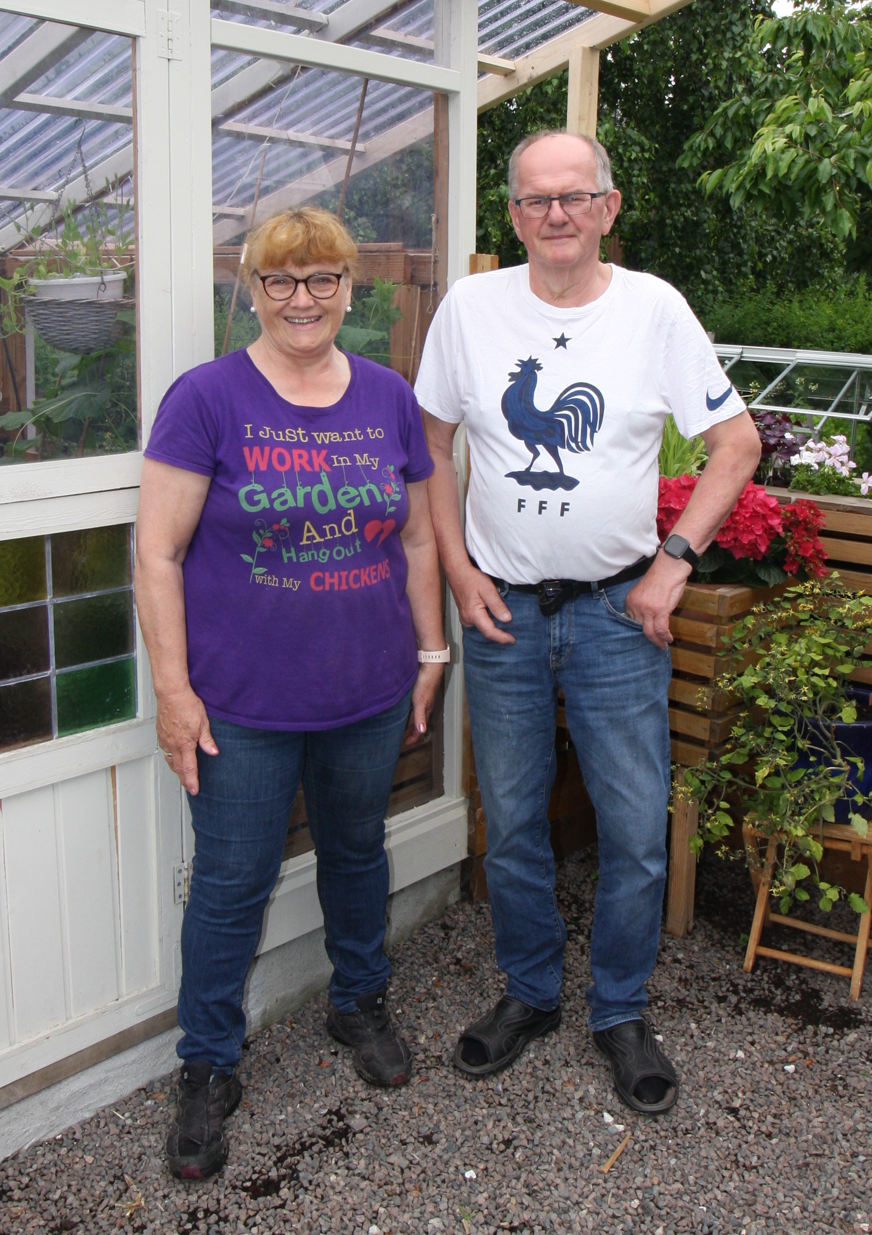 June Carlsen og Arne Rists t-skjorter sier alt: “I only want to work in my garden and hang out with my chickens” står det på hennes t-skjorte, mens han har en "haneskjorte".