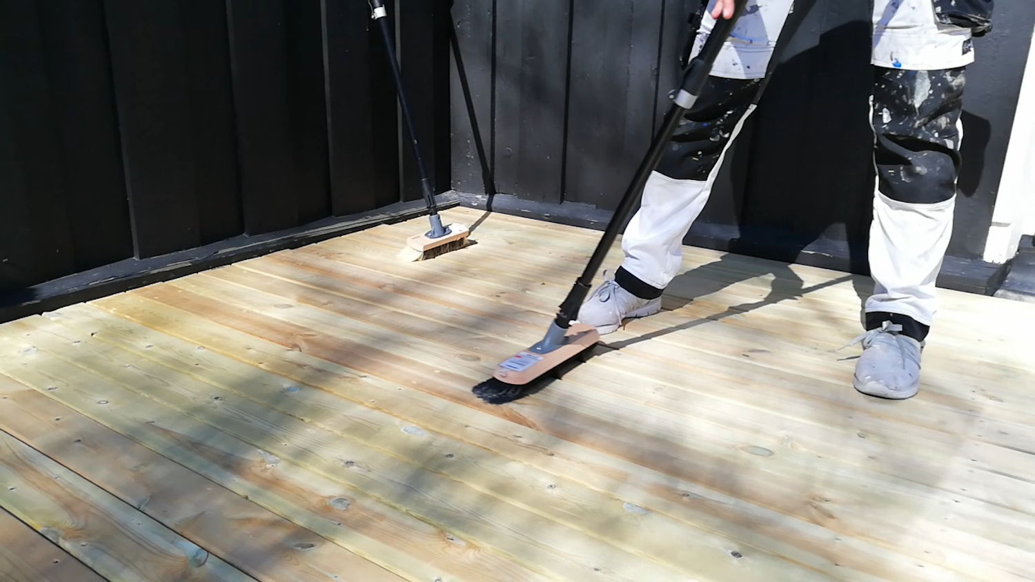 Vær oppmerksom på at ved påføring av en filmdannende overflatebehandling, det vil si en overflatebehandling som trekker inn i treverket, men samtidig danner en film på overflaten må overflaten vedlikeholdes jevnlig.