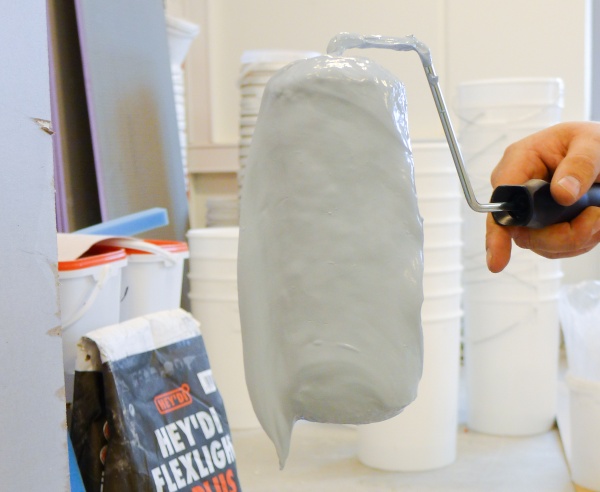 – Du skal aldri rulle rullen tørr, forklarer han, og begynner å stryke på membranen i vannrette strøk. Den legger seg tykt på veggen. Han dypper rullen ofte. Uten å vente på at det første laget tørker, ruller han på et nytt, denne gangen med loddrette strøk. Fortsatt med raus bruk av membranen. Om dette var maling ville det bare blitt søl, men membranen er tykkere, og fester bedre.