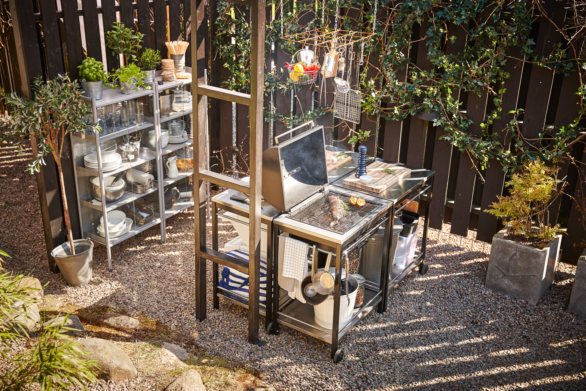 Har du ikke et tak å stå under, sett i tillegg opp en parasoll eller en pergola slik at du kan nyte de lyse sommerkveldene uten å bekymre deg verken for kald trekk eller noen regndrypp.