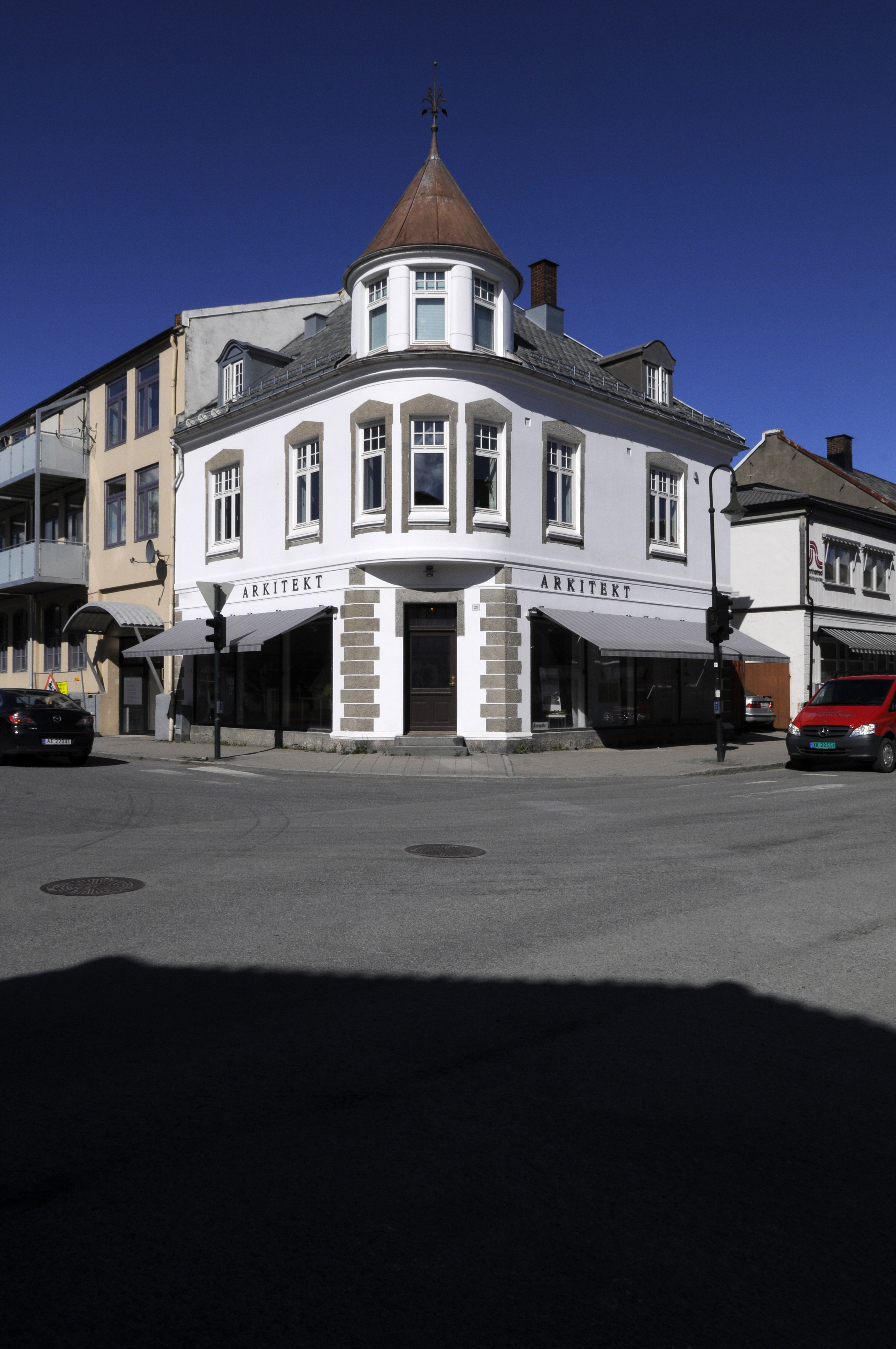 – Hele huset holdt på å forvitre. Gesimsen holdt på å ramle ned, og fasaden var malt med både plast- og oljemaling. Alt måtte fjernes. Nå er det ordentlig silikatmaling som er brukt, og aluminiumsplatene på taket er erstattet med skifer. Tårnet er metallbelagt.