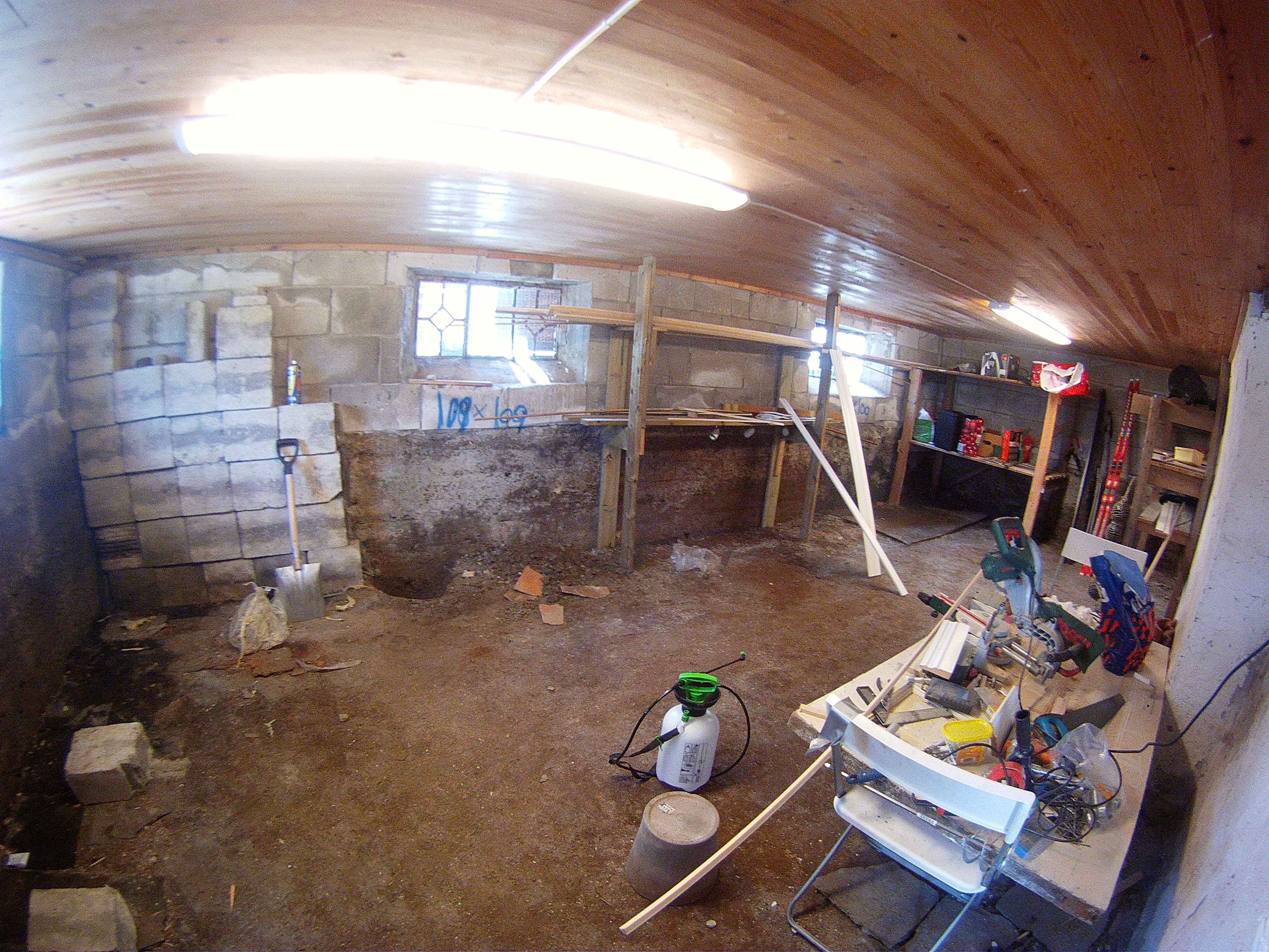 For å få full takhøyde ble de nødt til å grave seg nedover. En kjellervegg ble åpnet og inn kom en minigraver. Huset hadde kun en råkjeller med et enkelt støpt betonggulv i bunn.