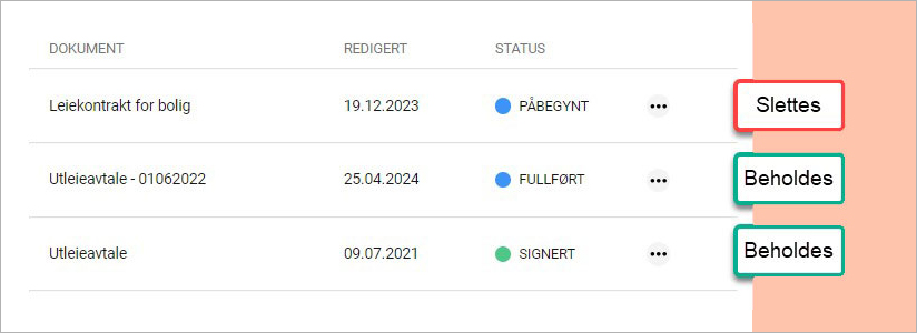 Alle eksisterende kontrakter som har statusen Fullført eller Signert vil bli overført til den nye plattformen. Du vil fortsatt ha tilgang til disse kontraktene, men kontrakter med statusen Fullført vil ikke lenger kunne gjennomgå en digital signeringsprosess. De kan imidlertid lastes ned for manuell signering om nødvendig.