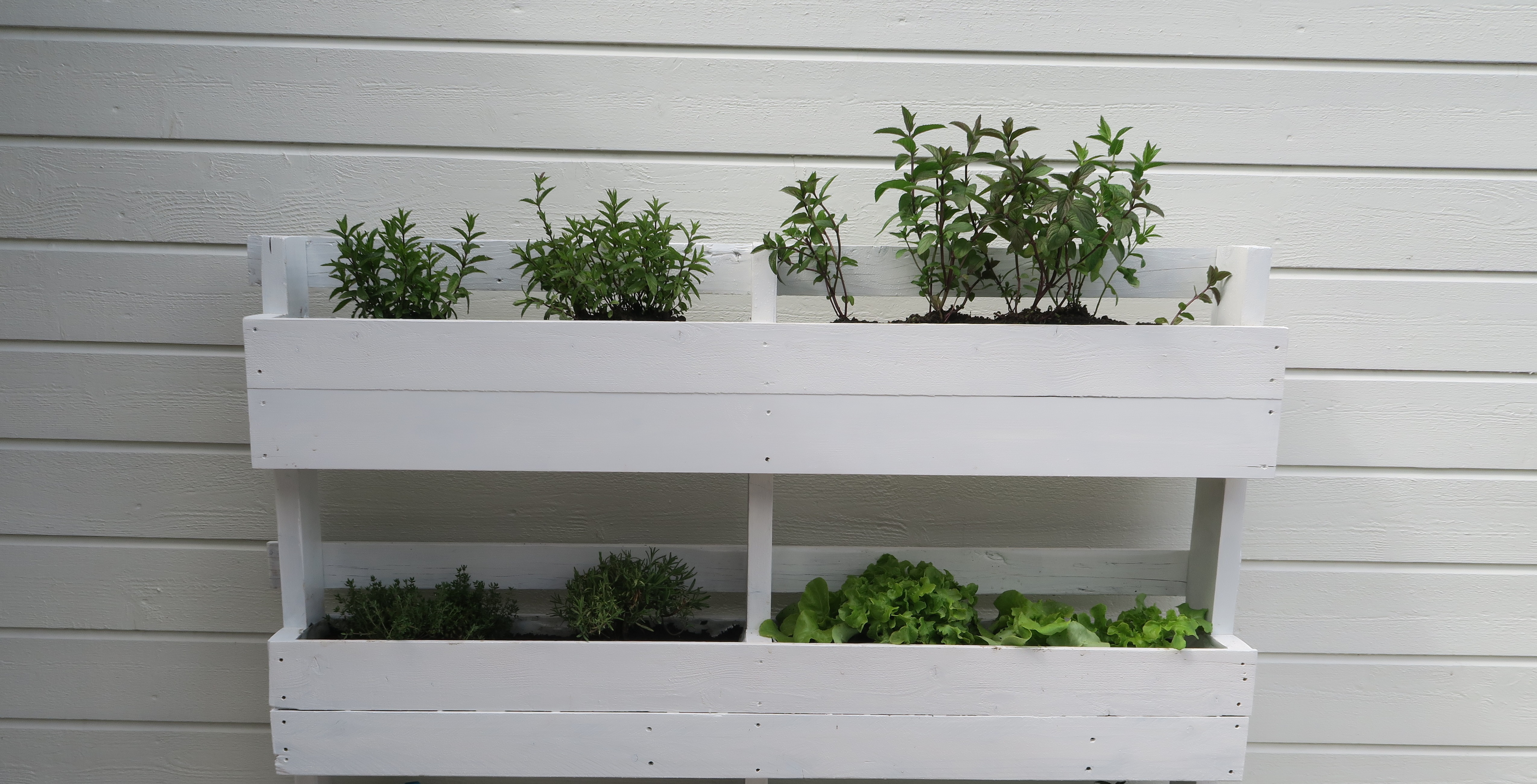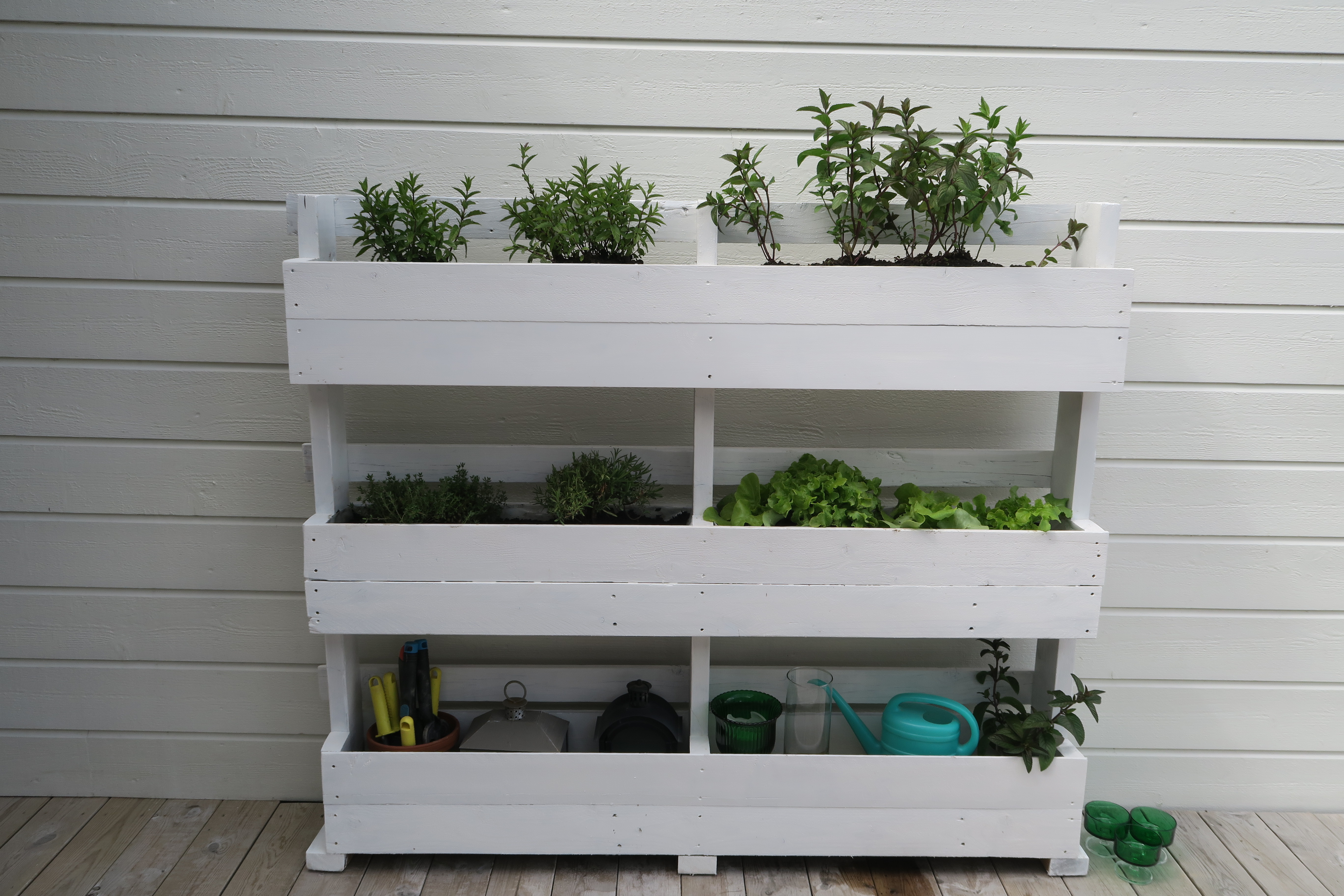 I øverste hylle plantet vi to forskjellige mynteslag. Vi elsker mynte, både til te og til en mojito. Napp av og spis et mynteblad, det gir deg frisk pust! I den neste ble det timian og rosmarin, perfekt for sommergrilling. Noen salater står ved siden av. Helt nederst har vi plassert redskaper, en vannkanne, lyslykter og ting vi bruker på balkongen.