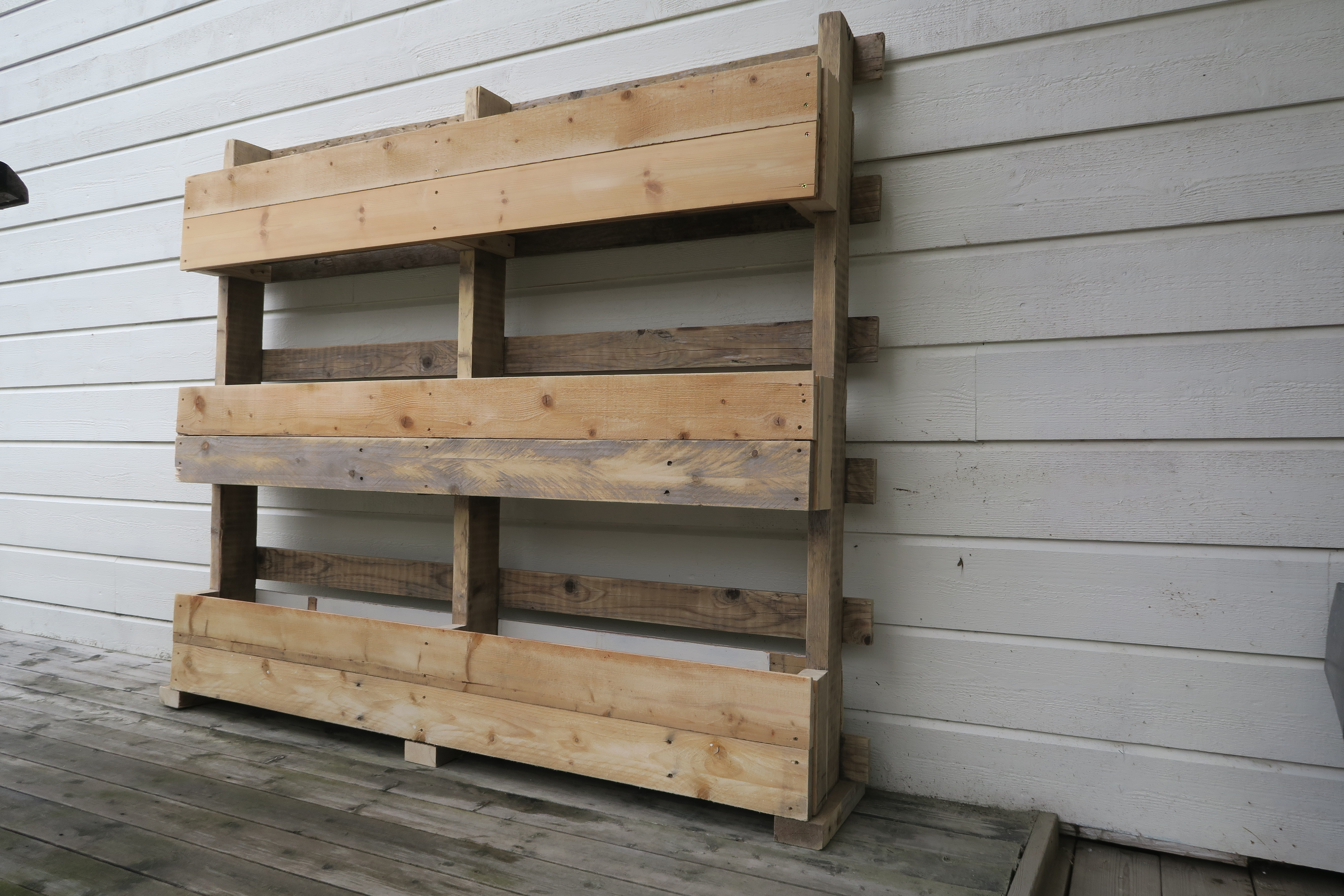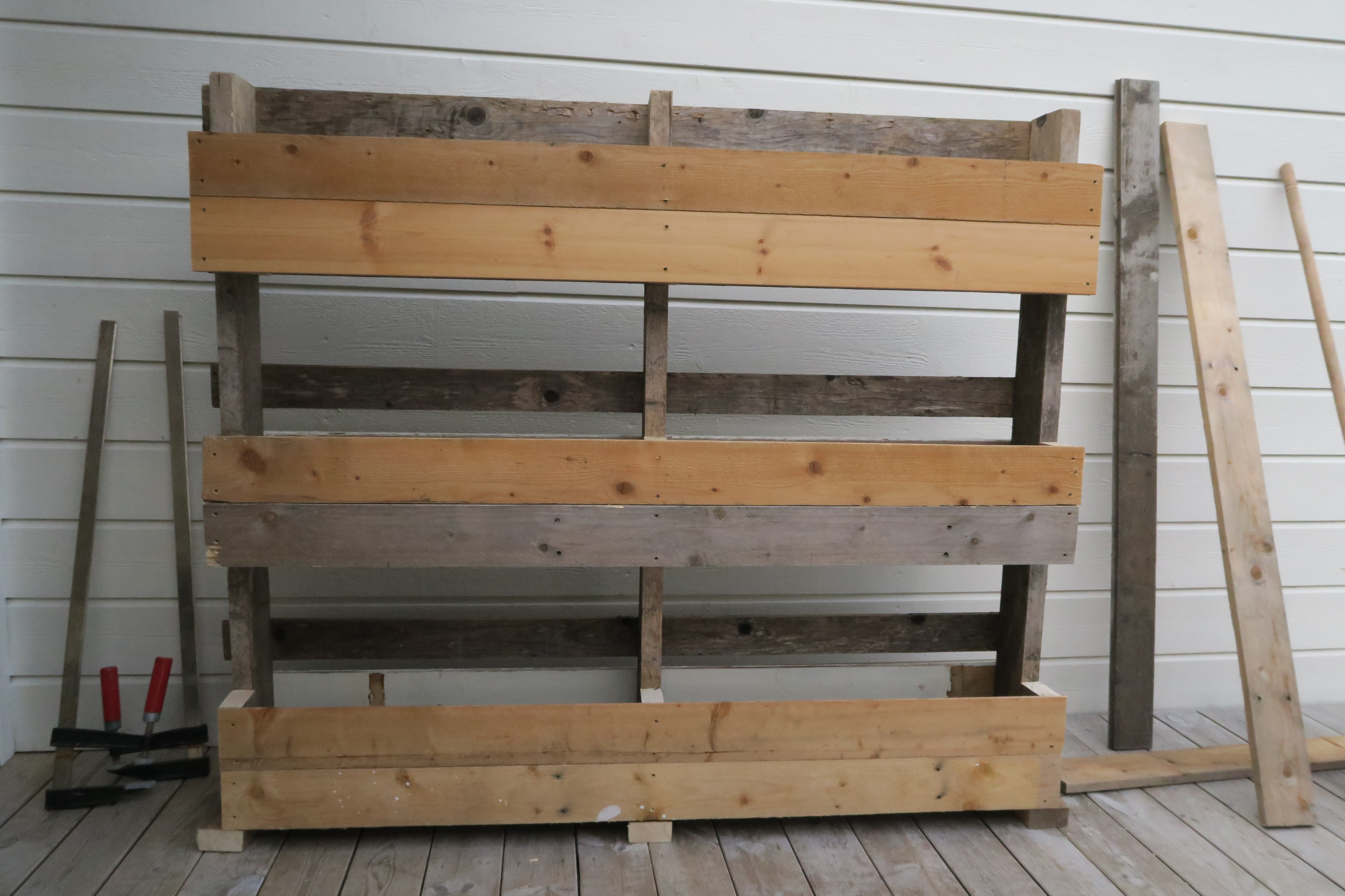 Nå er alle hyllene kommet på plass. Nå må vi skru fast planker i front og på baksiden slik at vi får hele plantekasser.