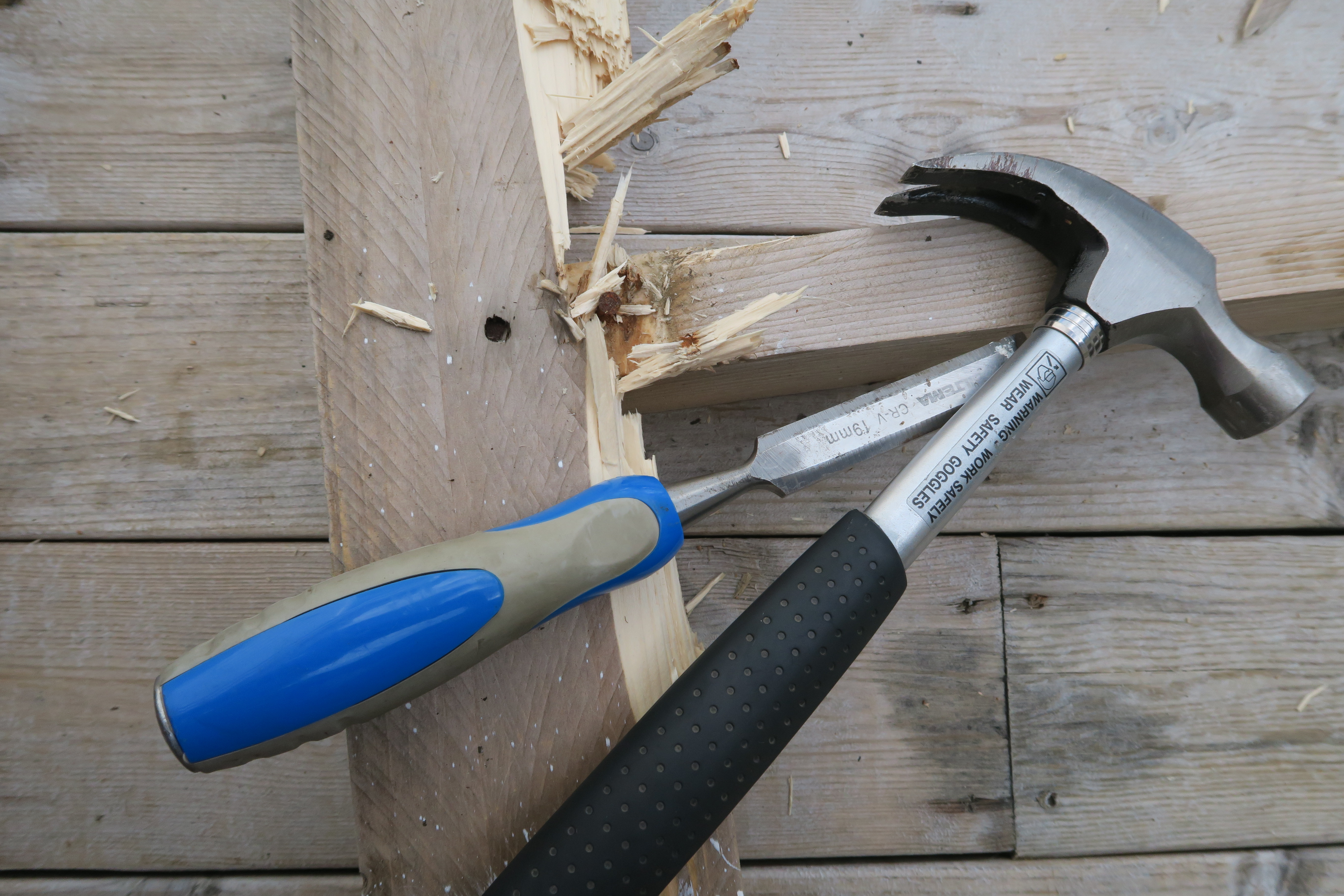 Med hoggjern, hammer og et brekkjern jobbet vi oss gjennom en vanskelig demontering. To av plankene ble delvis revet i stykker.