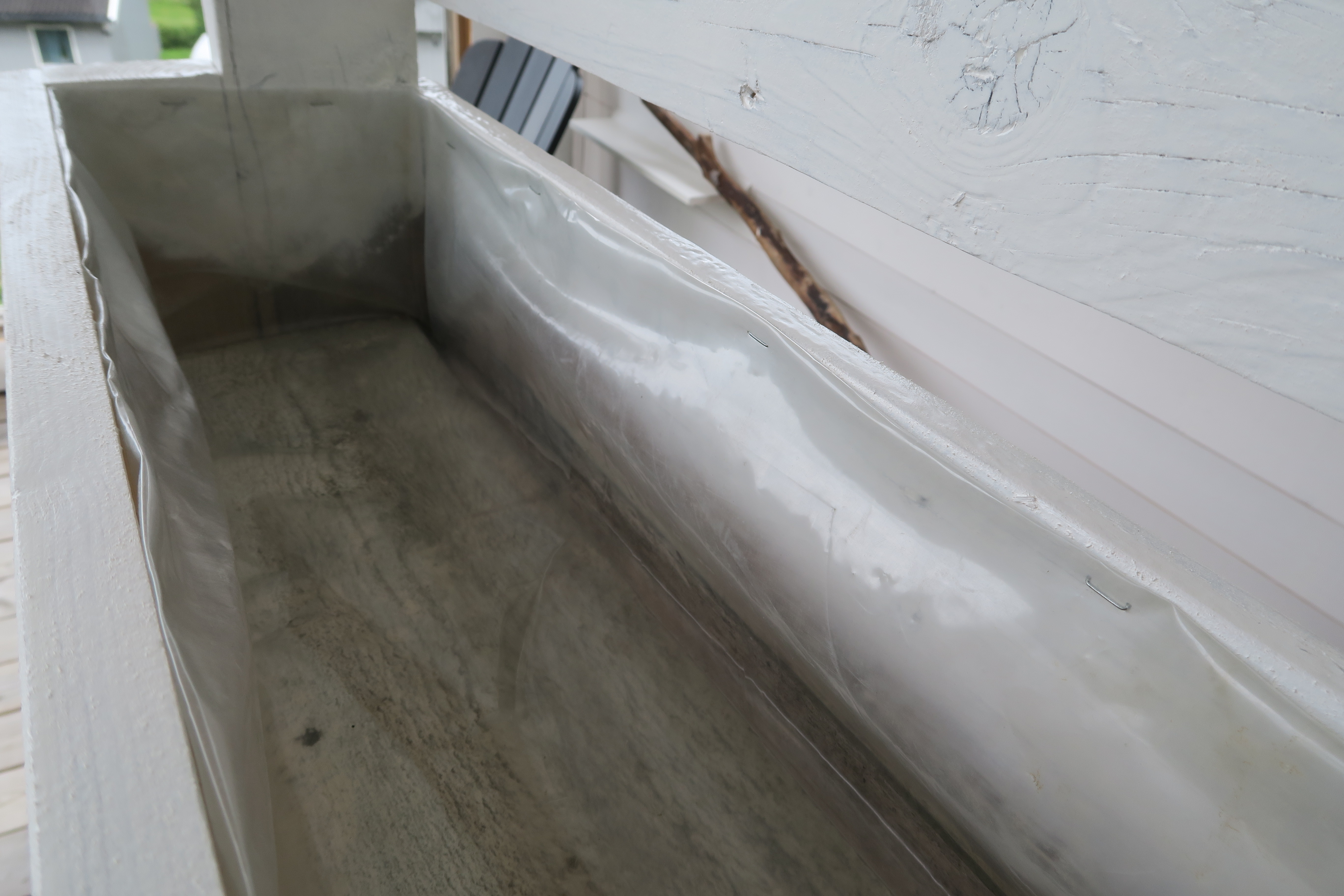 Vi planter direkte i kassene. Derfor må vi fore kassene med plast innvendig. Vi har brukt byggeplast som vi hadde liggende. Kanskje har du noen i omgangskretsen som har litt til overs?