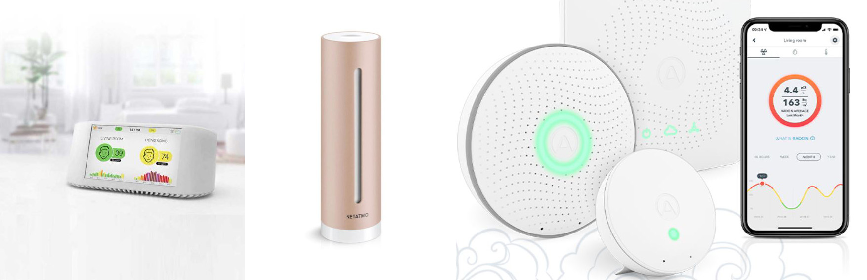 Noen ulike luftkvalitetsmålere som finnes på det norske markedet i dag. Fra venstre: Air visual, Netatmo og Airthings.