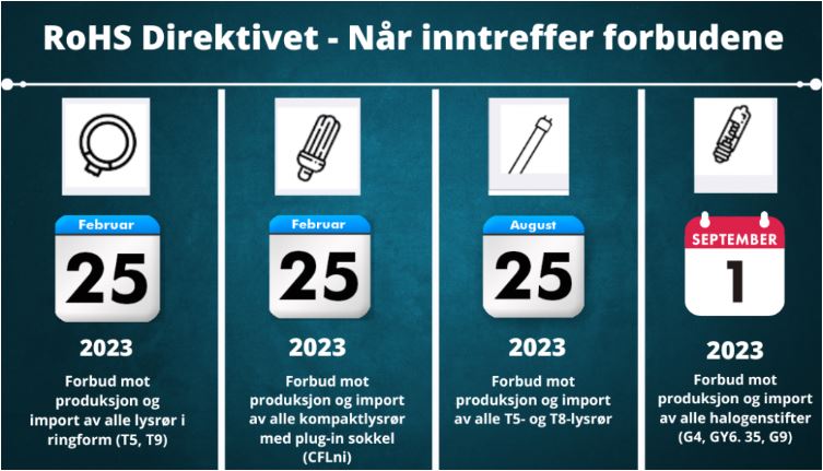 Lysstoffør og lignende inneholder kvikksølv og andre materialer som blir forbudt, halogenlyspærene er ikke energieffektive nok.