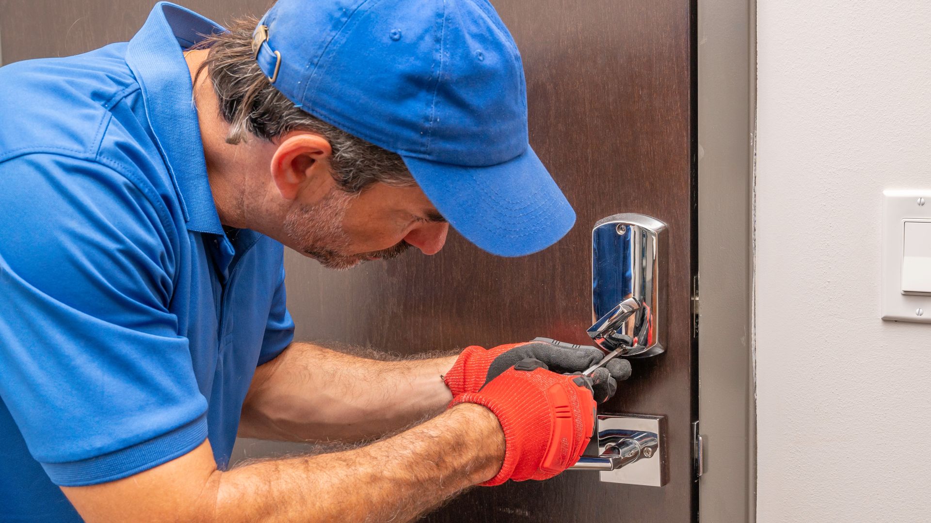 En mann kontrollerer at slukkeutstyr er i orden.